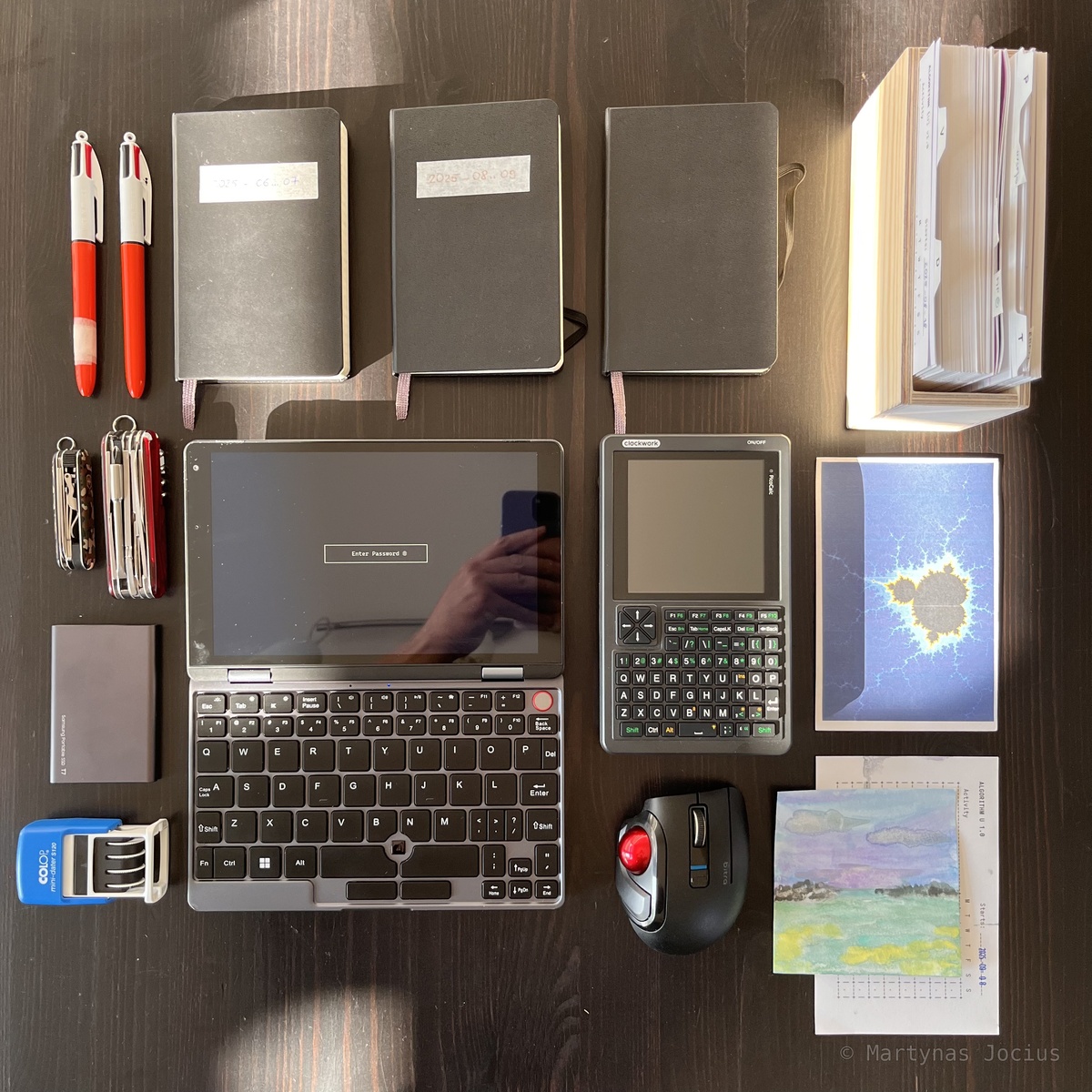 Mano kasdienis mažųjų įrankių rinkinys (every day carry arba EDC), pritaikytas ir studijai, ir kelionėms. Prie jo dažnai pridedamas ir vienas iš pagrindinių nešiojamų kompiuterių (darbo kontraktams Macbook, saviems projektams ThinkPad arba Macbook).